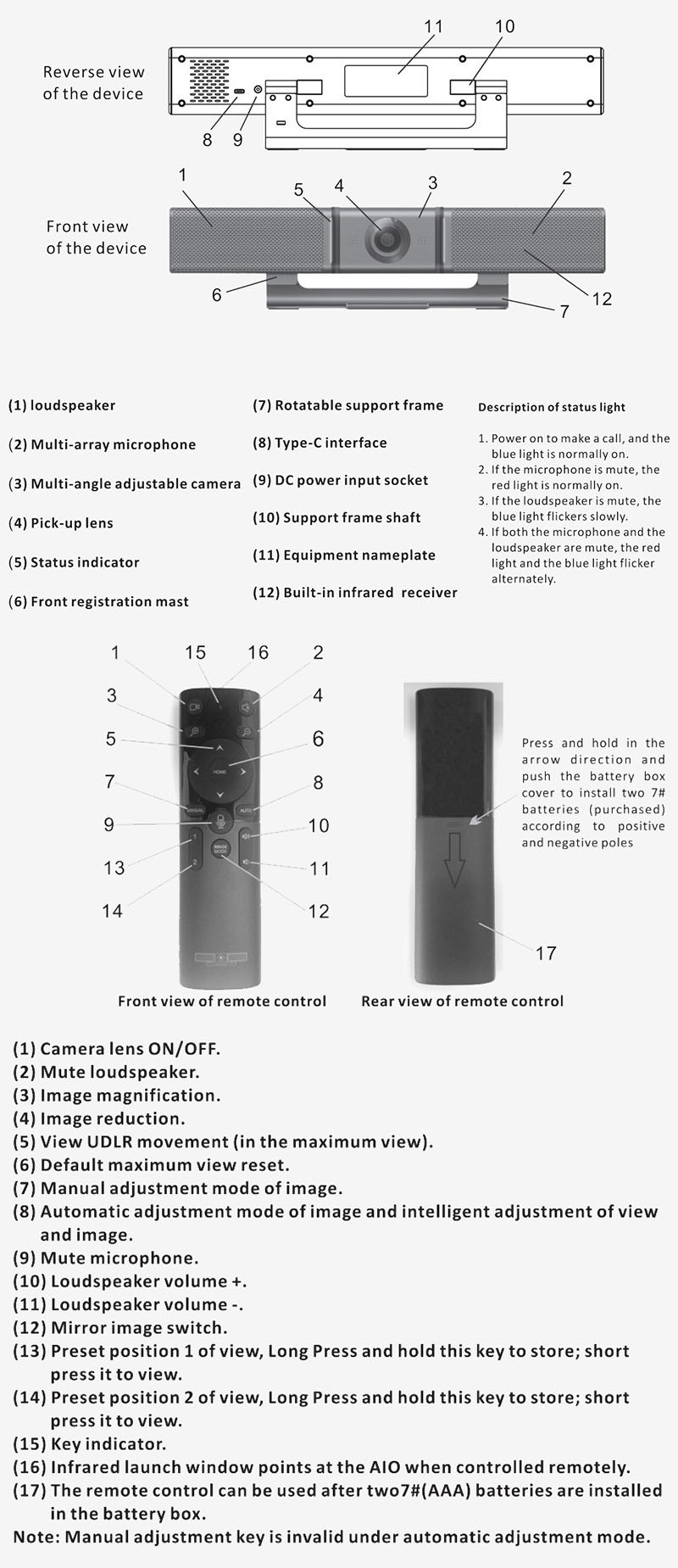 Audio video integrated conference equipment, 1080P HD 120° wide-angle camera is responsible for image transmission, 4 array microphones speakers are responsible for audio input output. It is convenient easy to deploy, is suitable for application scenarios such as daily meetings, distance education training, video live broadcasting, telemedicine, remote teaching.