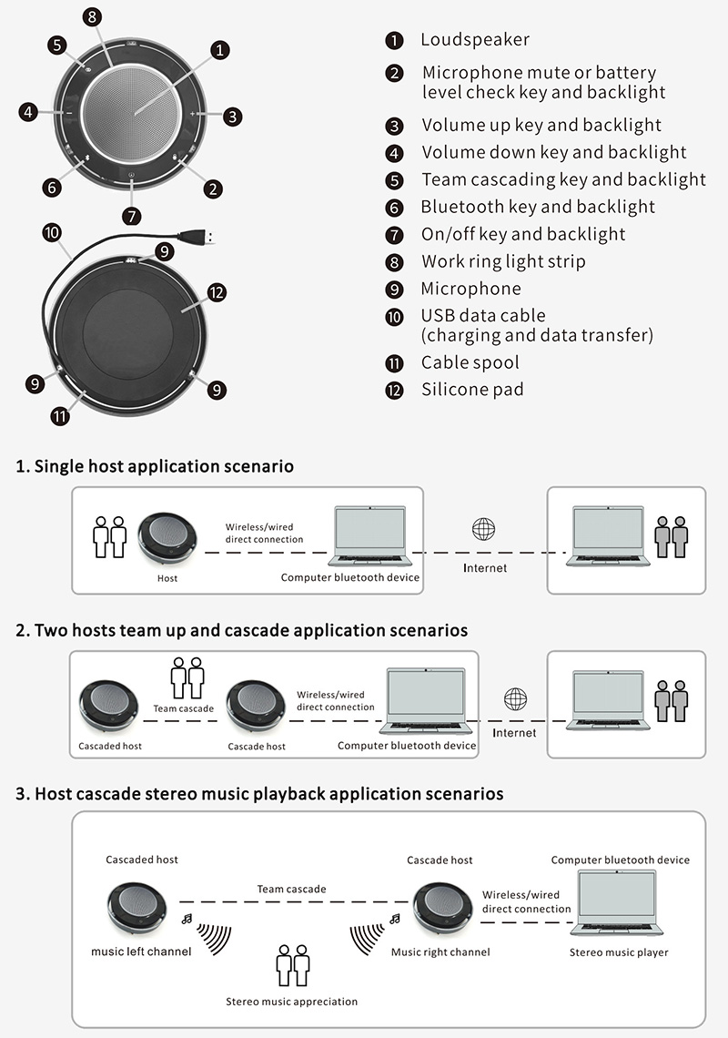 BT-35 can be freely switched between USB Bluetooth connections. It can be connected to a mobile phone or used with a Bluetooth receiver. Two devices can be wirelessly cascaded to receive playback sounds at the same time. There are 3 built-in omnidirectional microphones with a 360° omnidirectional sound pickup radius of up to 3-5 meters per unit.