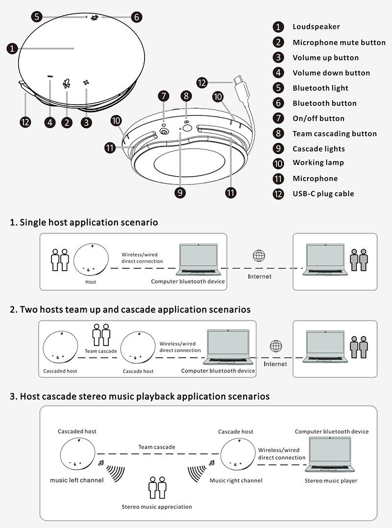 360° intelligent sound pickup, 384ms cancellation, intelligent dynamic noise reduction, automatic gain control, full duplex