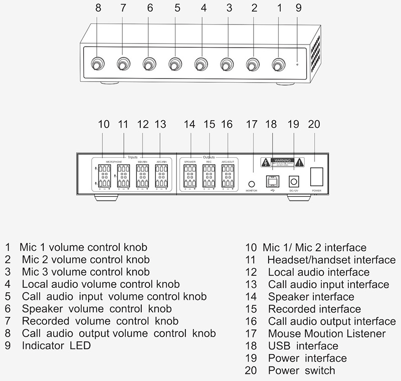 High-quality audio processor + 2-way wired ceiling microphone of educational interactive recording system, audio processor can be connected to active speaker playback, audio processor can be connected to headset, hheld microphone, mixer, recording box; 2-way ceiling microphone pickup; The host audio processor is equipped with separate input output volume adjustment knobs.