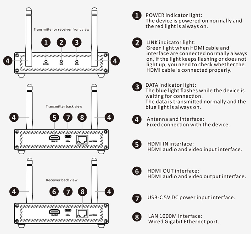 HT460 is an ultra-high-definition 4K 60Hz Blu-ray video wireless transmission device. Features high resolution, high refresh rate, "no" lag. Support up to 4096*2160 resolution 60Hz refresh rate. Direct network cable connection wireless 5.2G network transmission distance up to 100 meters.