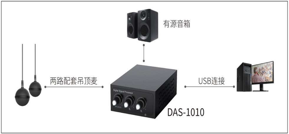 1、在音頻處理器背面對(duì)應(yīng)的鳳凰端口依次接入吊麥、有源音箱、12V電源后,連接USB,打開音視頻軟件。