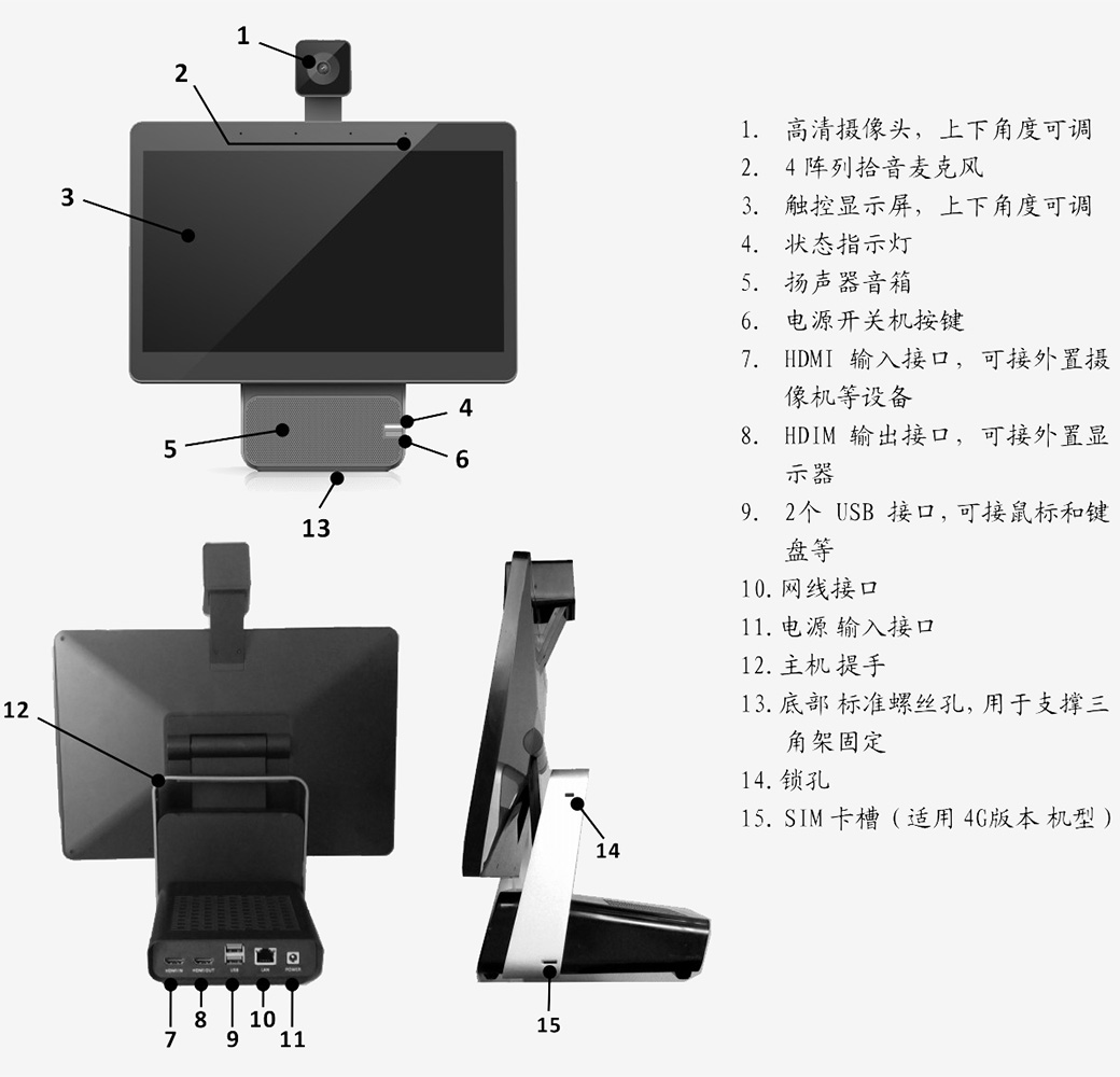 顯示屏、麥克風(fēng)、揚(yáng)聲器、攝像頭、虛擬屏幕鍵盤、電源接口、以太網(wǎng)接口、USB接口*2、HDMI IN接口、HDMI OUT接口
