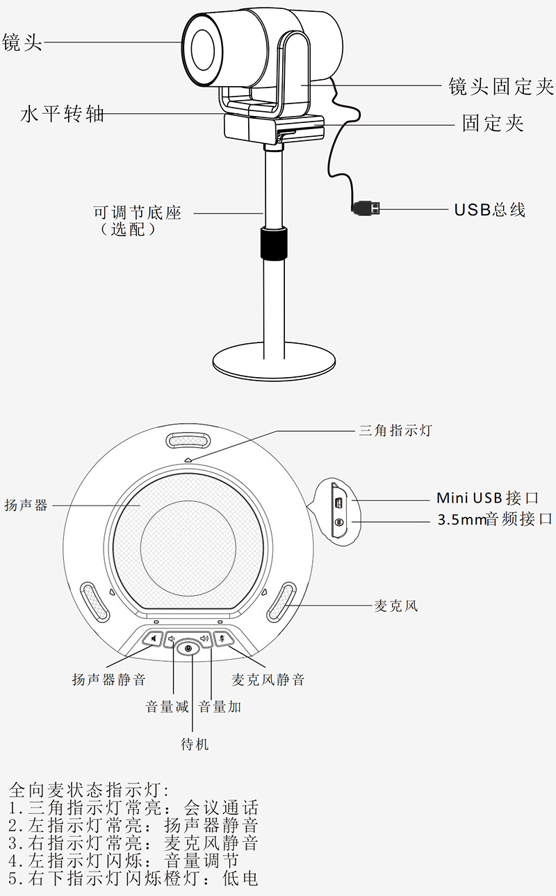 攝像頭USB總線供電;全向麥內(nèi)置可充電鋰電池