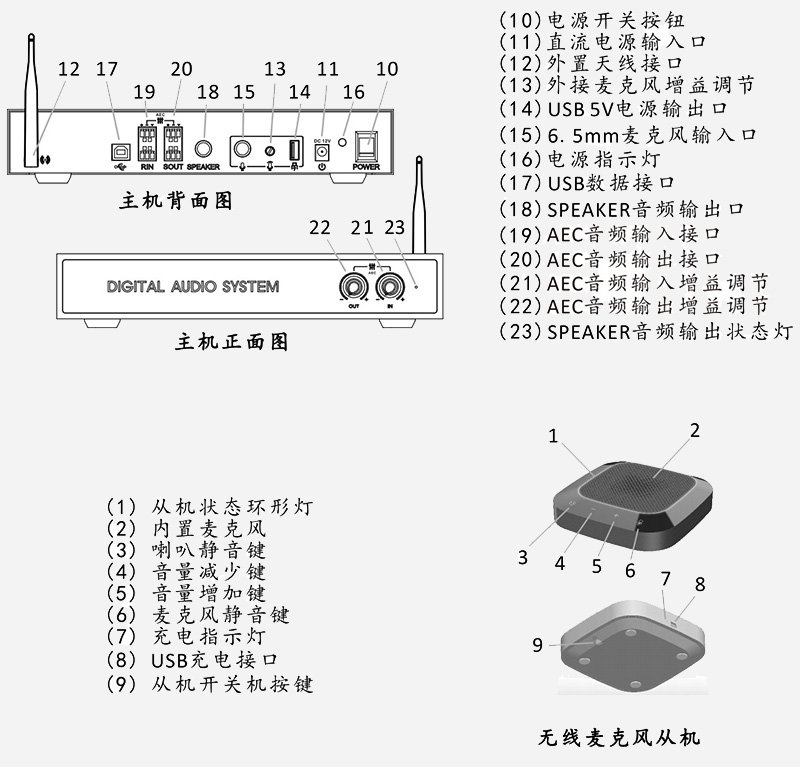 主機(jī)USB連接、模擬線路輸入輸出連接;全向麥無線連接